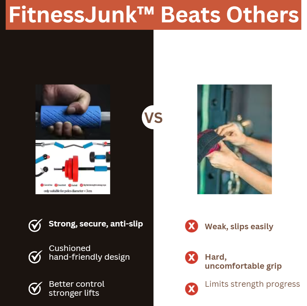 FitnessJunk™ comes out on top by delivering superior grip, durability, and performance. Our products offer safer lifting, better control, enhanced comfort, and long-lasting quality—outperforming generic alternatives in every workout, every rep, every time.