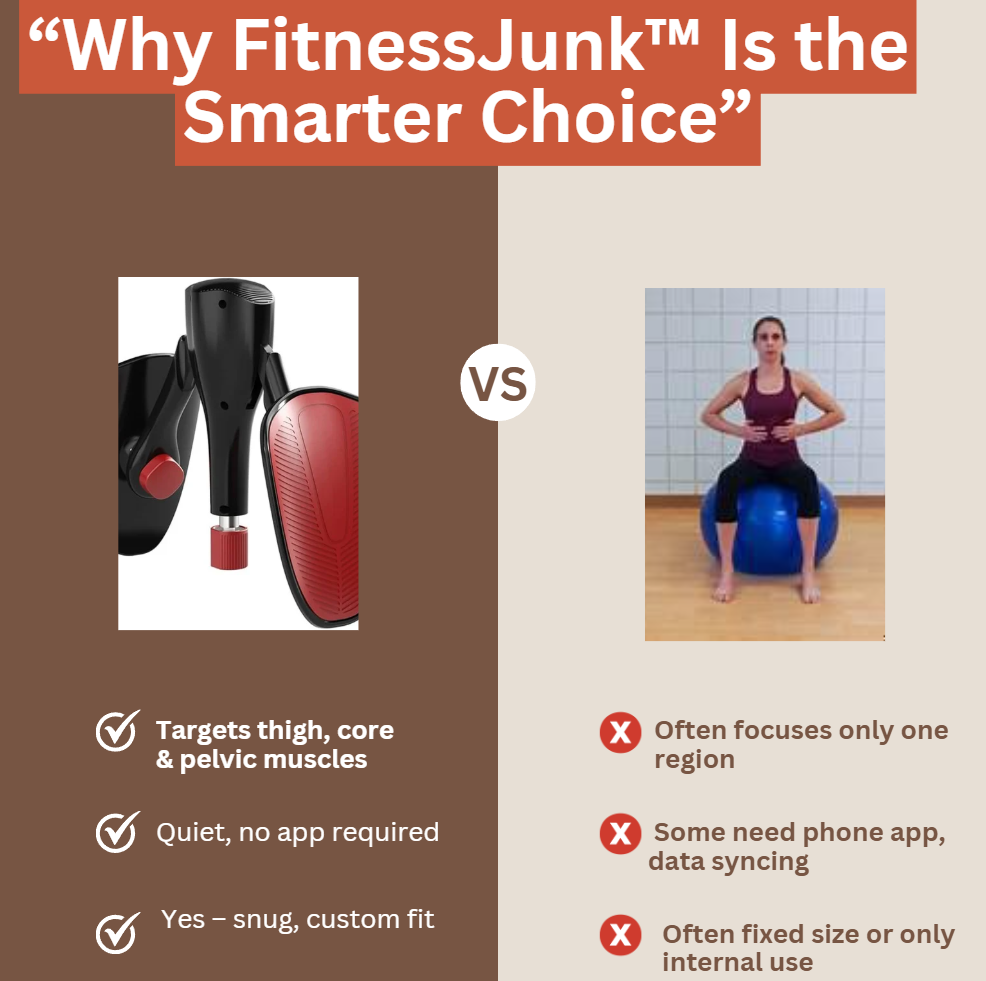 The FitnessJunk™ Trainer outperforms basic models with real‑time reps, adjustable thigh straps, and targeted levator/sphincter support. While conventional devices rely on manual effort or fixed resistance, this smart tool delivers tracked progression, core‑to‑thigh toning, and home convenience—giving you effective results, elite comfort, and visible improvement.